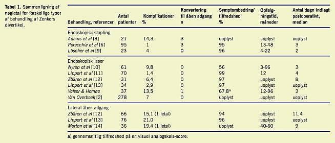 Denne undersøgelse blev gennemført med henblik på at vurdere behandlingsresultatet og patienttilfredshed efter endoskopisk laserbehandling af Zenkers divertikel på vores afdeling. Ved flere sammenlignende udenlandske studier er der fundet væsentlig flere og mere alvorlige komplikationer ved den åbne resektion i form af divertikulotomi eller divertikulopeksi af Zenkers divertikel end ved den endoskopiske resektion (Tabel 1 ). Disse komplikationer er blandt andre beskrevet af Illum & Aggerholm [5] og inkluderer persisterende parese af n. laryngeus recurrens samt purulent mediastinitis, en alvorlig livstruende komplikation, der i værste fald kan kræve torakotomi med kirurgisk sanering af infektionen og høj mortalitet.