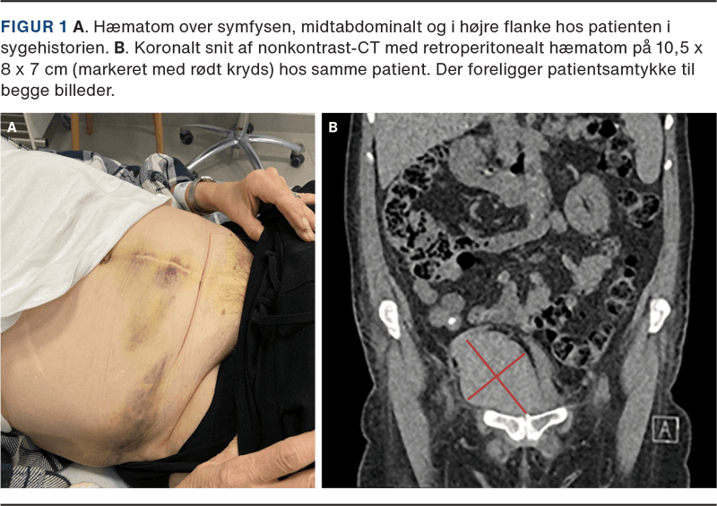 En 77-årig kvinde med OAB blev henvist til urologisk modtagelse med en følelse af urinretention og blæresmerter. Hun havde dagen forinden fået intravesikale injektioner med BoNT-A, hvilket hun havde fået fast hver sjette måned gennem fem år uden bivirkninger, fraset et enkelt tilfælde med urinretention på 500 ml. Patienten var ikke i blodfortyndende behandling og havde ikke indtaget fiskeolie op til proceduren. I modtagelsen udviklede hun blodtryksfald (69/43 mmHg), men stabiliserede sig hurtigt uden intervention (104/69 mmHg). Der blev anlagt kateter à demeure (KAD) og udtømt 200 ml urin, som medførte umiddelbar smertelindring. Hæmoglobinkoncentrationen var 7,1 mmol/l, og KAD blev seponeret. De efterfølgende tre dage kontaktede patienten telefonisk urologisk afdeling to gange grundet svære blæresmerter og højresidige abdominalsmerter, der blev behandlet med fast paracetamol og ibuprofen. Seks dage efter indgrebet blev patienten igen henvist til urologisk modtagelse på grund af vedvarende stærke smerter i højre fossa af jagende karakter. Objektivt fandt man et palpationsømt hæmatom over symfysen, midtabdominalt og i højre flanke (Figur 1 A). Patienten var ikke peritoneal. Hæmoglobinkoncentrationen var faldet til 6,3 mmol/l, og på mistanke om retroperitoneal blødning udførte man abdominal CT uden kontrast. Denne viste et retroperitonealt hæmatom på 10,5 × 8 × 7 cm, som forskubbede blæren mod venstre (Figur 1 B). Der blev anlagt KAD til aflastning og smertelindring og udtømt 500 ml urin. Dagen efter faldt hæmoglobinkoncentrationen yderligere til 5,9 mmol/l, hvor CT af abdomen med kontrast udelukkede igangværende blødning. Opfølgende abdominal CT med kontrast to måneder senere påviste, at der ikke var blødning på malign baggrund, og at et resthæmatom var eneste patologi.