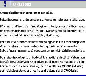 Summary Forensic anthropology Ugeskr Læger 2009;171(37):2643-2645 Forensic anthropology is the application of biological or physical anthropology in the service of justice. One main area is the analysis of human remains. Such analyses involve person identification by assessment of age and sex of the deceased, and comparison with ante-mortem data. Another major area is the analysis of surveillance pictures and videos. Such analyses may comprise facial and bodily morphological comparisons, multi-angle photogrammetry and gait analysis. We also perform studies of human remains for archaeologists.