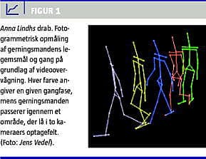 En retsantropologisk billedanalyse havde stor betydning i opklaringen af et røveri i 2001. Politiet havde igangsat et større efterforskningsarbejde, da røveriet havde den ulykkelige udgang, at en uskyldig blev dræbt af en af gerningsmændene. Gernings-mændene optrådte med integralmotorcykelhjelme, hvilket gjorde ansigtsgenkendelse umulig, og en indledende vurdering af f.eks. legemshøjde var derfor vigtig for politiet. Da banken var udstyret med flere overvågningskameraer med overlappende felter, blev det muligt for første gang i denne type sager at benytte såkaldt fotogrammetri. Denne analysemetode muliggjorde meget præcise opmålinger af gerningsmændene og senere i forløbet opmåling af en af de mistænkte, med efterfølgende sammenligning. Under arbejdet med dette blev det også klart, at en af gerningsmændene havde en noget karakteristisk gangart, som man senere genfandt hos en mistænkt [9]. Denne sag betød, at disse retsantropologiske billedanalyser efterfølgende blev benyttet i forbindelse med efterforskningen af drabet på den svenske udenrigsminister, Anna Lindh [10] (Figur 1 SPAN> ). Metoderne er nu helt indarbejdet i det retsantropologiske arbejde, og de bruges jævnligt. Metoderne er naturligvis genstand for vedvarende kontrol og forskning. Således har et netop afsluttet ph.d.-forløb beskæftiget sig med opmålingsvariation og -fejl, samt hvorledes gangdata kan behandles statistisk i sammenligningsøjemed [11]. Denne forskning foregår i et tæt samarbejde med især Biomekanisk Enhed under Institut for Neurovidenskab og Farmakologi ved Det Sundheds-videnskabelige Fakultet (Copenhagen Gait Centre ).