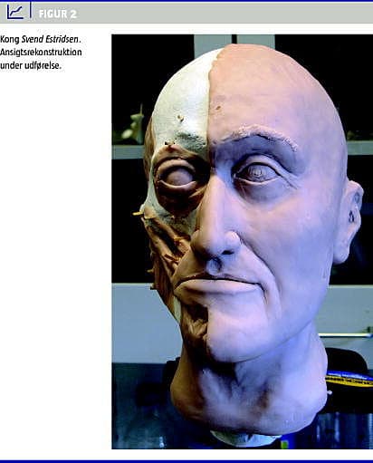 Et meget klart resultat af dette ses ved kraniofacial rekonstruktion. Metoden er dels anatomisk baseret, dvs. at de enkelte muskler og muskelgrupper »lægges på« som ler eller plasticin, dels baseret på målinger over bløddelstykkelser ved forskellige referencepunkter, hvorved små pinde tilskæres den gennemsnitlige bløddelstykkelse for et bestemt referencepunkt, fastgøres til kraniet, og ler eller plasticin bygges op mellem disse pinde. Herhjemme har metoden været meget brugt i museumssammenhæng [18], f.eks. senest ved rekonstruktionen af ansigtet på kong Svend Estridsen , den sidste vikingekonge, hvis skelet lå i en pillegrav i Roskilde Domkirke [19] (Figur 2 ). Endelig har vor enheds beskæftigelse med arkæologiske fund koblet med retsantropologisk og retspatologisk viden betydet, at vi regnes blandt verdens førende inden for udforskningen af mumier og moselig [20].