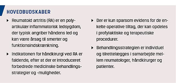 Der er flere håndkirurgiske behandlingsmuligheder, og der kan indgå komplekse overvejelser i valget af den rette behandling. Det er nødvendigt med individuel vurdering af operationsindikationen på basis af patientens ønsker og forventninger og den aktuelle håndfunktion. Mange patienter med svære fejlstillinger kan ofte stadig opretholde en god håndfunktion, og operation er derfor ikke nødvendigvis indiceret. Håndkirurger synes ofte, at patienter med RA bliver henvist for sjældent og for sent [6]. En af hovedårsagerne til, at kirurger og reumatologer kan have forskellige holdninger til kirurgi, er, at der ikke forligger særlig meget evidens på området – randomiserede studier er svære at udføre. Det er derfor ikke muligt at lave evidensbaserede kliniske retningslinjer, og beslutningen må derfor bero på en dialog mellem reumatologen, håndkirurgen og patienten.