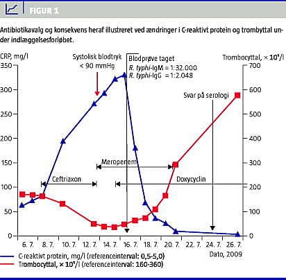 Patienten fik kvalme, mavesmerter, diare og tiltagende trombocytopeni til 37 × 109 /l. På mistanke om rickettsiose blev behandlingen suppleret med doxycyclin (Figur 1 ). Han fik yderligere cerebral påvirkning i form af konfusion.