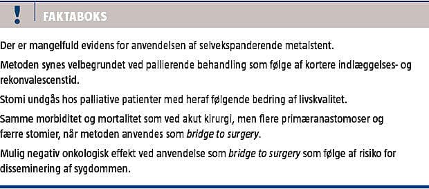 indlæggelses- og rekonvalescenstid end ved akut operation, ligesom det formentlig giver en bedre livskvalitet at undgå stomi. Som bridge to surgery med efterfølgende elektiv operation er resultaterne meget modstridende, afhængigt af om de stammer fra enkeltserier fra dedikerede ekspertcentre eller fra små randomiserede multicenterundersøgelser, hvor de sidste har de dårligste resultater, men måske, som anført af nogle, bedst afspejler daglig praksis. Det mest bekymrende er imidlertid den mulige negative effekt på langtidsoverlevelsen, på grund af at metoden i sig selv indebærer en risiko for disseminering af sygdommen. Anvendelsen af SEMS er dog efterhånden så