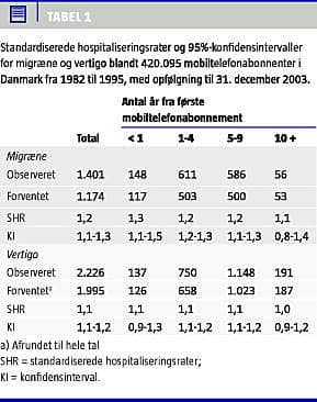 Vores resultat rejser naturligt spørgsmålet om, hvilke faktorer der fører til hospitalskontakt med henholdsvis migræne eller svimmelhed, da kun en lille del af disse patienter vil blive henvist til et hospital [5]. Selv om et højt arbejdspres har været associeret til forekomsten af migræne, og arbejdsbetinget stress forekom mere hyppigt blandt norske og svenske mobiltelefonbrugere [6], så havde vi ingen forventninger om, at der ville være en højere forekomst af disse sygdomme blandt kohortemedlemmerne. En antagelse om, at medlemmerne i kohorten, der var karakteriseret ved en højere indkomst sammenlignet med befolkningen i øvrigt [3], skulle have nemmere adgang til specialiserede afdelinger, forekommer spekulativ. Forekomst af migræne var højst i den første tid efter datoen for første abonnement, hvilket kunne tyde på en større opmærksomhed på symptomer hos brugerne af mobiletelefoner, men samlet set var der ikke et dosis-repons-mønster mellem tiden fra første abonnement til diagnose af en af de to tilstande.