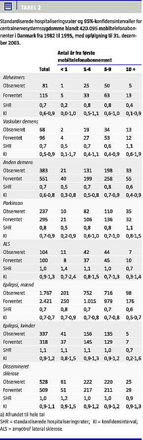 Milliarder af mennesker anvender mobiltelefoner samtidig med, at der er en vedvarende bekymring for, at disse telefoner kan udgøre et helbredsproblem [1]. De fleste videnskabelige undersøgelser har fokuseret på, om der var en øget risiko for hjernetumorer blandt brugere af mobiltelefoner, og hovedfundet i disse undersøgelser er, at der ikke kan identificeres en sådan øget risiko hos brugere, der har anvendt mobiltelefoner i ti år eller mere, men det kan ikke udelukkes, at der faktisk er en øget risiko ved langtidsbrug ud over disse ti år [2]. Det har i en række oversigtartikler været diskuteret, om elektromagnetiske felter, som vi kender dem fra strømforsyningen, kunne være en risikofaktor for Alzheimers demens, amyotrof lateral sklerose (ALS) og andre sygdomme i centralnervesystemet (CNS). Man har dog ikke mistanke om, at disse felter kan fremkalde vaskulært betinget demens, epilepsi eller Parkinson. I en retrospektiv kohorteundersøgelse, der var baseret på registerinformationer, sammenlignede vi raterne for hospitalsindlæggelse med en CNS-sygdom blandt samtlige danske private mobiltelefonabonnenter i perioden 1982-1995 med raten i den danske befolkning.