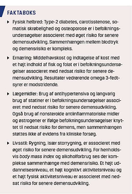 Resultater fra epidemiologisk forskning indikerer, at helbredsforhold og livsstil midt i livet har betydning for risikoen for at få demens. Det estimeres, at 31,4% (95% konfidens-interval: 15,3-46,0%) af alle tilfælde af Alzheimers sygdom i Europa kan tilskrives fysisk inaktivitet, rygning, lavt uddannelsesniveau, depression, hypertension, fedme og diabetes [28, 29]. Flerspektrede interventioner rettet mod kostændring, fysisk og kognitiv træning samt monitorering af vaskulære risikofaktorer hos ældre vil vise, om demensrisikoen kan nedsættes [30].