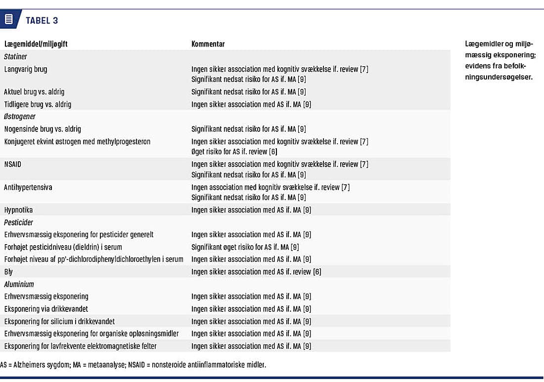 Statiner menes at have en modificerende indflydelse på risikofaktorer for demens [17]. Langvarig eller igangværende anvendelse af statiner er knyttet til signifikant nedsat demensrisiko, hvorimod man i studier, hvor man har sammenlignet tidligere versus aldrig brug af statiner, ingen sammenhæng har fundet (Tabel 3) [9]. Evidensen for NSAID er modstridende. Ifølge en metaanalyse er brug af NSAID associeret med en signifikant nedsat risiko for demens i kohorte-, men ikke i case-kontrol-studier [9]. Modsat tyder resultater fra kliniske undersøgelser på, at NSAID kan øge risikoen [6]. Anvendelse af antihypertensiva er knyttet til signifikant nedsat risiko for demens [9], men ikke til kognitiv svækkelse [7]. Der er ikke påvist en sammenhæng mellem brug af hypnotika og demens [9]. Kliniske forsøg med lægemidler mod demens til ældre med MCI ser ikke ud til at mindske risikoen for yderligere kognitiv svækkelse eller demens [5-7]. Brug af østrogener er knyttet til signifikant nedsat risiko for demens i befolkningsundersøgelser [9], men ikke i kliniske undersøgelser, der dog overvejende var baseret på østrogenbehandling af ældre (60+-årige) kvinder [18].