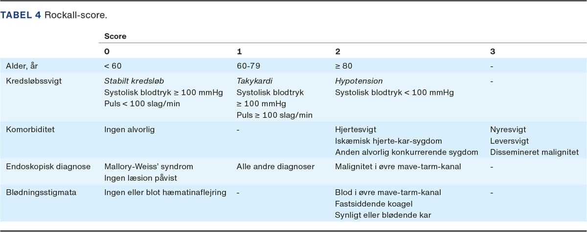 I 1996 publicerede Rockall et al et scoringssystem til prædiktion af reblødning og død blandt patienter med ØGIB [7]. Studiet var designet som et prospektivt multicenterstudie som led i en national audit i Storbritannien. I første del af studiet blev 4.185 cases anvendt til udvikling af Rockall-score, der efterfølgende blev valideret i en kohorte på 1.625 patienter. Rockall-score kan inddeles i en præendoskopisk og en postendoskopisk del. Denpræendoskopiske delomfatter alder, tegn på shock (takykardi eller arteriel hypotension) og komorbiditet. Den postendoskopiskedel omfatter yderligere den endoskopiske diagnose samt blødningstigmata (Tabel 4). I begge kohorter var en Rockall-score ≤ 2 associeret med en reblødningsrate på < 5% og en dødelighed på < 1%. Der var en klar association mellem stigende mortalitet og reblødning ved stigende Rockall-score. Patienter med en Rockall score > 6 havde høj risiko for reblødning (32,9%) og død under indlæggelsen (48,9%). Udtrykt ved AUROC har Rockall-score dog kun en beskeden styrke for prædiktion af hhv. mortalitet og reblødning i niveauerne 0,72-0,79 [17, 20] og 0,62-0,63 [17].