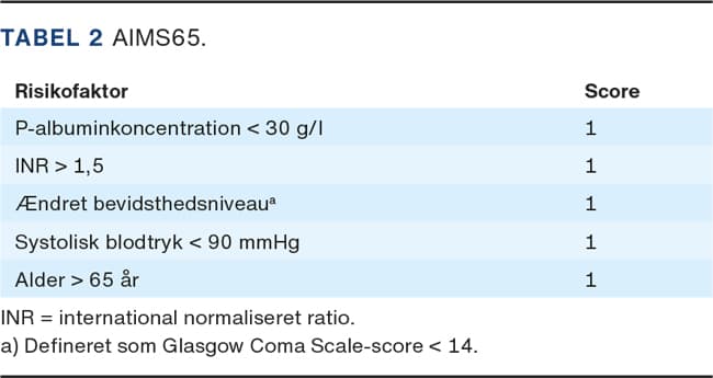 I et amerikansk studie fra 2011 præsenterede Saltzman et al [10] et simpelt scoringssystem kaldet AIMS65 (Tabel 2) til prædiktionen af død under hospitalsindlæggelse, indlæggelsesvarighed og ressourceforbrug for patienter med ØGIB. Ved hjælp af en stor database med data fra 187 hospitaler udviklede forfatterne AIMS65 ud fra en kohorte på 29.222 patienter og validerede efterfølgende scoringssystemet i en stor kohorte på 32.504 patienter med ØGIB.