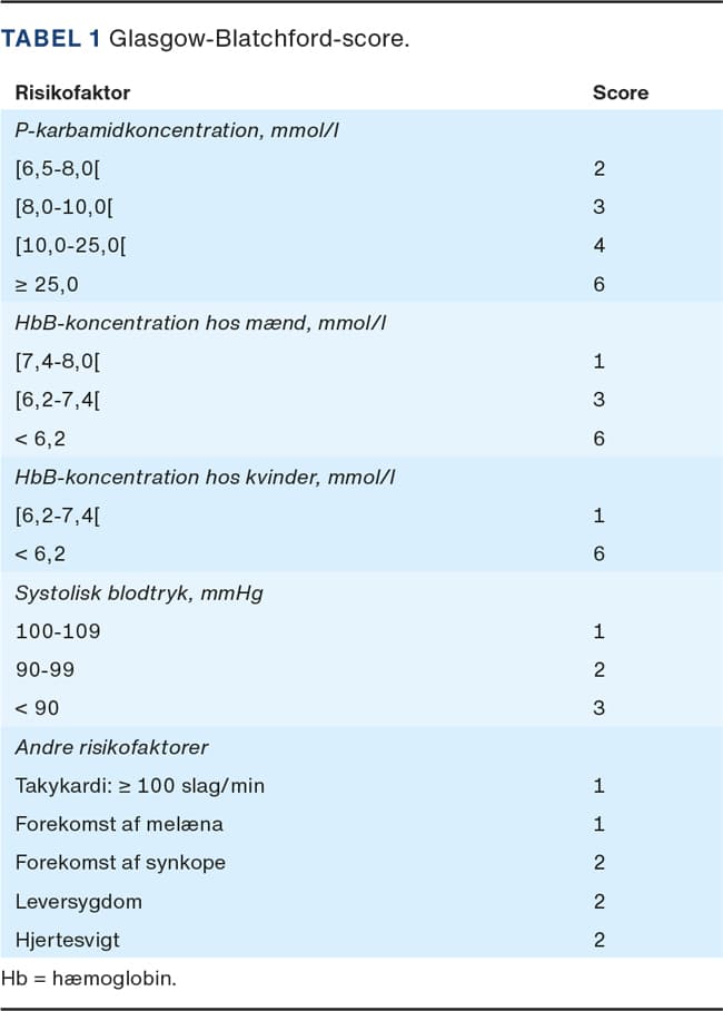 Øvre gastrointestinal blødning (ØGIB) er med en incidens på 103-134/100.000 pr. år en hyppig årsag til indlæggelse [1, 2]. Dødeligheden har været let faldende i det seneste årti og ligger nu på 2-9% [2-4], dog med stor variation afhængigt af de underliggende blødningskilder, hvor ulcus- og variceblødning medfører mortalitetsrater på 8-14% [1, 5, 6]. Der er blevet udviklet flere scoringssystemer som kliniske beslutningsværktøjer til prædiktion af udkomme, såsom behov for indlæggelse, indlæggelsesvarighed, hospitalsbaseret intervention, reblødning og død. Nogle scoringssystemer kræver kendskab til fund ved endoskopi [7, 8], mens andre allerede kan beregnes præendoskopisk, når der foreligger blodprøvesvar [9-11]. Man har påvist, at anvendelse af scoringssystemer som led i den primære vurdering af patienter med ØGIB reducerer antallet af hospitalsindlæggelser, afkorter indlæggelsesvarigheden og reducerer ressourceforbruget [12, 13]. På den baggrund anbefales rutinemæssig anvendelse af risikoscoringssystemer i såvel nationale som internationale retningslinjer på området [14-16].