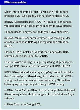 Hvorfor nu al den opmærksomhed? Svaret er todelt: 1) Opdagelsen af RNAi kaster helt nyt lys på vores genom og udvikling af genetiske sygdomme. Rækken af genetiske sygdomme, der skyldes fejl i proteinkodende gener, er som bekendt meget lang, og for mange sygdomme er de molekylærgenetiske årsager nøje beskrevet. Er det muligt, at genetiske sygdomme kan skyldes geners fejlregulering som følge af fejl i RNAi-maskineriet, eller at RNAi-processer kan have en supplerende rolle i sygdomsudvikling? Vi kender stadig ikke det præcise svar, men ved i dag, at nedsatte niveauer af visse dobbeltstrengede RNA-molekyler (såkaldt miRNA), der afkodes fra distinkte loci i vores genom, synes at korrelere med udvikling af adenokarcinomer (f.eks. kolorektal adenokarcinom) og kronisk lymfatisk leukæmi. Det foreløbige estimat forudsiger, at ca. 30% af vores gener reguleres af miRNA-molekyler via cellens RNAi-apparat. 2) De åbenlyse terapeutiske muligheder i RNAi er måske den væsentligste årsag til den store interesse ikke mindst fra den molekylærmedicinske verden og lægemiddelindustrien. I et utal af in vitro- og in vivo-studier har man allerede påvist, at dobbeltstrenget RNA-sekvens specifikt kan slukke for gener og dermed forhindre produktion af sygdomsfremkaldende proteiner, der ikke er mulige målmolekyler i konventionelle behandlingsstrategier. En række lovende prækliniske undersøgelser med forsøgsdyr synes at kunne bane vejen for anvendelse af RNA-baserede præparater hos patienter. Således er kliniske testforsøg igangsat i USA. Vi beskriver her den molekylære baggrund for RNA-interferens og giver eksempler på terapeutisk anvendelse af RNAi på vej mod udvikling af individualiseret genetisk medicin.