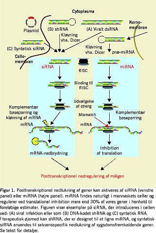 RNAi aktiveres ved tilstedeværelse af dobbeltstrenget RNA, der f.eks. introduceres i celler i forbindelse med virusinfektion (Figur 1, venstre panel). Dobbeltstrenget RNA kløves i mindre stykker a 21-23 basepar, kaldet siRNA (for small interfering RNA) af proteinkomplekset Dicer. Efterfølgende genkendes siRNA af proteinkomplekset RISC, der ud fra termodynamiske parametre udvælger en af de to siRNA-strenge. Herefter søger RISC i kompleks med siRNA (nu enkeltstrenget) efter en mRNA-streng med komplementær sekvens, og efter dannelse af komplementær baseparring mellem siRNA og mRNA kløves og nedbrydes mRNA-strengen med nedsat produktion af f.eks. viralt protein til følge. Det er altså mRNA og ikke genet i sig selv, der er målet for genregulering via RNAi. Der er ikke fundet endogent udtrykt siRNA hos mennesker. Derimod producerer menneskers celler miRNA, der forlader kernen som et hårnåleformet præ-miRNA (Figur 1, højre panel). I cytoplasmaet kløves præ-miRNA af Dicer til miRNA, der binder til RISC og mRNA i nævnte rækkefølge. I modsætning til siRNA er baseparringen mellem miRNA og mRNA ikke fuldstændig, og miRNA/mRNA-komplekset inducerer ikke kløvning af mRNA-strengen, men hæmmer i stedet translation af protein.