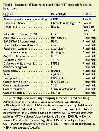 I betragtning af RNAi-metodens relativt unge alder er der allerede publiceret et stort antal in vivo-studier relateret til præklinisk udvikling af siRNA-lægemidler. Resultaterne fra disse studier har internationalt ansporet mere end 30 farmaceutiske og bioteknologiske firmaer til at påbegynde udvikling af terapeutiske præparater baseret på RNAi-teknologien. Som det fremgår af Tabel 1 anvendes RNAi allerede i en lang række prækliniske og kliniske forsøg til behandling af bl.a. infektionssygdomme, cancer, neurodegenerative sygdomme, okulære lidelser og allergi.