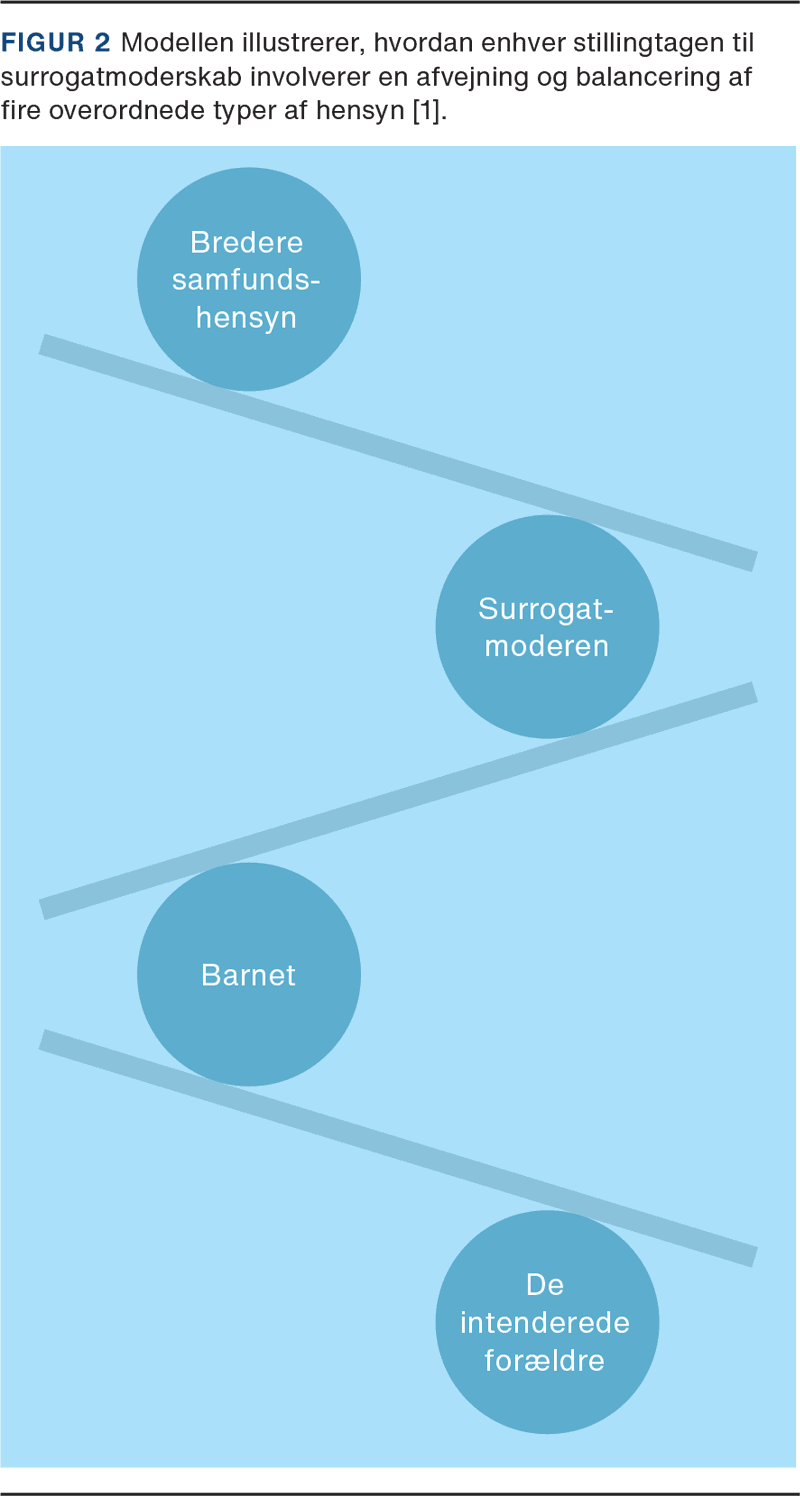Surrogatifeltet er komplekst og udfordrer juridiske og etiske fænomener såsom forældreskab, samfundsansvar og økonomi, retten til at kende sit genetiske og biologiske ophav mod retten til anonymitet, fortrydelsesretten, medicinsk beslutningstagning, den enkelte kvindes ret over egen krop, til love, der forsøger at beskytte selvsamme kvinde mod udnyttelse af reproduktive organer [25, 26] (Figur 2). Altruistisk surrogati fremstilles ofte som mere etisk korrekt end kommercielt surrogati, men denne skelnen mellem altruistisk og kommercielt er efterhånden udvandet. For hvor går grænsen mellem en gave af varierende størrelse som tak for at bære graviditeten til en reel honorering? Hvad med tabt arbejdsfortjeneste? Det Etiske Råd afspejler denne udvanding ved, at et flertal ikke anbefaler kommercielt surrogati, men stemmer for en altruistisk model, men med et kompensationsbeløb som symbolsk anerkendelse og dækning af tabt arbejdsfortjeneste [1].