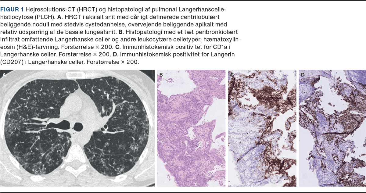 HRCT viser i tidlige stadier små, centrilobulære noduli, som over tid kan udvikle sig til uregelmæssige og tyndvæggede cyster (Figur 1 A). PLCH regnes også blandt de cystiske lungesygdomme, idet cystedannelsen udgør et centralt patoanatomisk træk. De tyndvæggede cyster er årsagen til den forhøjede forekomst af spontan pneumothorax. Disse forandringer er primært lokaliseret i midt- og overzonen, mens de basale og subpleurale områder oftest er relativt skånet [9]. Den nodulære fase kan differentialdiagnostisk give udfordringer og forveksles med maligne infiltrater, og den sencystiske fase er svær at skelne fra emfysem. Histopatologisk ses karakteristiske peribronkiolære infiltrater med ophobning af langerhanske celler (Figur 1 B), der immunhistokemisk er positive for CD1a (Figur 1 C), Langerin (CD207) (Figur 1 D) og S100. Der er ofte ledsagende eosinofile granulocytter, lymfocytter og makrofager, og destruktion af bronkiolernes væg med dannelse af afrundede eller stjerneformede noduli, der bliver tiltagende fibrotiske og kan kavitere.