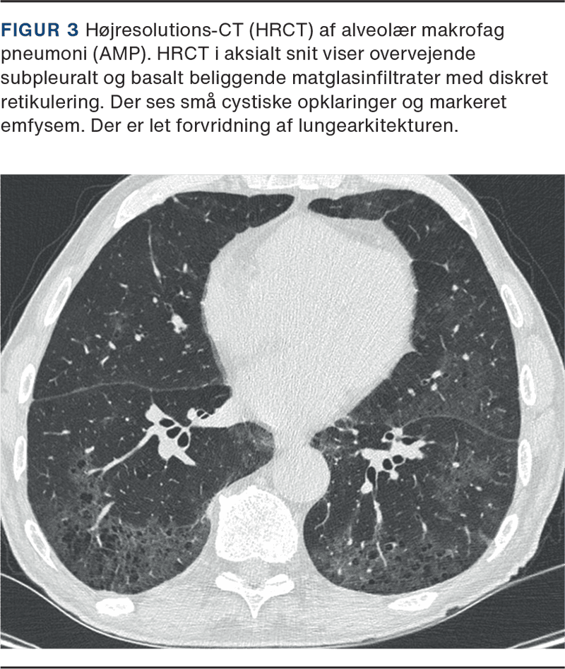 HRCT viser typisk bilaterale basale matglasforandringer ofte med emfysem og mindre hyppigt cystiske forandringer. Der ses ofte fin retikulering i områderne og forvridning af arkitekturen (Figur 3) [16]. Histologisk ses ensartet diffus ophobning af pigmenterede makrofager i alveolerne med let interstitiel inflammation, men uden tydelig fibrose og med bevaret lungearkitektur [17].