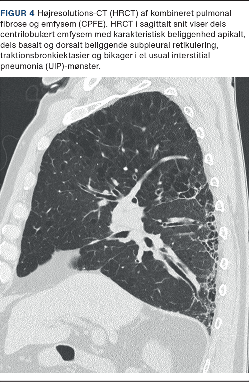 Kombineret pulmonal fibrose og emfysem (CPFE) betragtes af nogle som et syndrom karakteriseret ved samtidig forekomst af fibrose og emfysem hos storrygere [22]. Patienterne præsenterer sig med udtalt dyspnø, men har relativt normale eller kun let nedsatte værdier for forceret eksspiratorisk volumen i det første sekund (FEV1) og forceret vitalkapacitet (FVC) med bevaret eller let forhøjet FEV1/FVC-ratio. Dette skyldes, at den restriktive komponent fra fibrosen og den obstruktive komponent fra emfysemet kan udligne hinanden ved spirometri [23]. I kontrast hertil ses betydelig funktionsnedsættelse, anstrengelsesudløst hypoksæmi og svært nedsat DLCO. Pulmonal hypertension er en hyppig komplikation rapporteret hos 15% til 55% af patienter med CPFE [24]. Udredning af de fibrotiske forandringer følger den samme udredning som ved patienter uden emfysem. Prognosen er generelt dårlig og sammenlignelig med eller værre end IPF alene, især ved tilstedeværelse af pulmonal hypertension. Antifibrotisk behandling kan overvejes, men brugen og effekten er endnu ikke fuldt belyst [22].