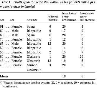I alt ti af fjorten testede patienter havde således god effekt af teststimulation og fik permanent system implanteret. Efter mediant fire en halv måneds stimulation med permanent system havde ni af de ti patienter stadig god effekt af sakralnervestimulation (Tabel 1 ).