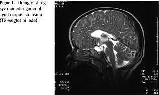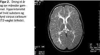 MR-skanning af cerebrum ved SS viser hypoplasi af corpus callosum og hyperintensitet af den subkorticale hvide substans (indikerer defekt myelinisering) (Figur 1 og Figur 2 ). Svært afficerede patienter har atrofi af cortex, hjernestamme og cerebellum samt cerebellar hypomyelinisering og periventrikulær hyperintensitet [8, 9].