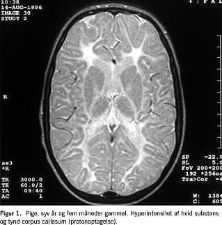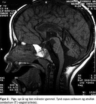 En grundig neurometabolisk screening viste normale resultater af følgende undersøgelser: urinaminosyrer og organiske syrer, lysosomale enzymaktiviteter, kreatinkinase, myoglobin, carnitin, acetylkolinreceptorantistoffer, nerveledningshastighed, muskelbiopsi (inkl. elektronmikroskopi), meget langkædede fede syrer, fytansyre, laktat og pyrovat. Der var ingen vakuoliserede lymfocytter otte måneder gammel (lysmikroskopi). Oftalmoskopi, audiometri, hjernestammeaudiometri og CT af cerebrum var normale. Initialt var elektroencefalografi (EEG)-værdierne normale, men da pigen var 7 år gammel, viste EEG diffus lavfrekvent aktivitet (2-3Hz) og et spike-focus. En MR-skanning af cerebrum viste omfattende mangel på myelinisering i de cerebrale hemisfærer, manglende myelinisering af cerebellum og en tynd corpus callosum og hjernestamme (Figur 1 ). Vermix cerebellum var udtalt atrofisk, og der fandtes nogen atrofi af cerebrum (Figur 2 ).