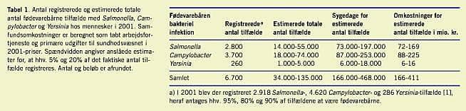 I 2001 blev der registreret 7.824 Campylobacter-, Salmonella- og Yersinia-infektioner. Afhængigt af underrapporteringsgraden forårsagede disse patogener 34.000-135.000 fødevarebårne infektioner (Tabel 1 ). Samlet medførte disse infektioner 166.000-468.000 sygedage, og samfundets direkte omkostninger var i 2001 166-411 mio. kr. (Tabel 1).