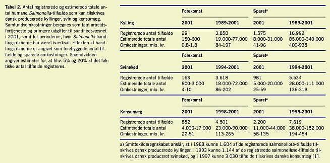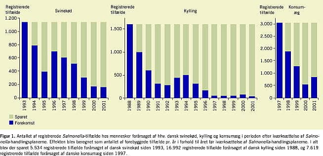 Resultater: I 2001 registreredes 7.824 tilfælde af gastroenteritis forårsaget af Salmonella, Campylobacter og Yersinia. Det reelle antal fødevarebårne infektioner anslås til 34.000-135.000, svarende til omkostninger på 166-411 mio. kr. Iværksættelsen af Salmonella -handlingsplanerne mindskede imidlertid antallet af infektioner, og i perioden 1989-2001 blev samfundsudgifterne i forbindelse med Salmonella -infektioner hos mennesker reduceret med ca. 730-1.707 mio. kr. Samlet anslås handlingsplanerne i perioden 1994-2001 at have kostet godt 1,3 mia. kr.