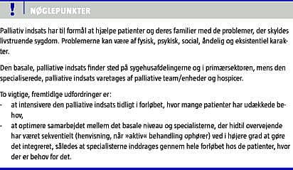 Det er derfor endnu ikke muligt at basere denne artikel på officielle danske retningslinjer, der beskriver, hvordan den palliative indsats bør organiseres.
