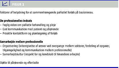Herudover bør samarbejdet mellem de professionelle både inter- og tværsektorielt være koordineret og integreret [7, 12, 13]. Der er her både organisatoriske og samarbejdskulturelle udfordringer (Figur 1 ), idet en del af det manglende samarbejde mellem primær- og sekundærsektoren synes at bunde i utilstrækkelig faglig respekt for og indsigt i arbejdsforholdene hos »de andre« [12]. Nedbrydning af disse barrierer gennem klargøring af kommunikationsveje og rutinemæssige kontakter på fastlagte tidspunkter i forløbet samt øget personligt kendskab til samarbejdsparterne vil formentlig føre til forbedret kvalitet af den palliative indsats [12].