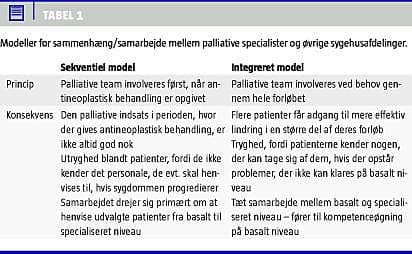 Som illustreret i Tabel 1 kan dette samspil mellem det basale niveau og specialisterne foregå sekventielt (de palliative team kommer først ind i billedet, når behandlingen af patienterne afsluttes fra f.eks. onkologiske afdelinger) eller integreret. Den sekventielle model er forsat meget udbredt, hvilket bl.a. kan ses af, at den mediane levetid for patienter, der henvises til specialiseret, palliativ indsats, kun er ca. 22 dage (foreløbig opgørelse fra Dansk Palliativ Database, februar 2011). I en nationalt repræsentativ undersøgelse af de danske kræftpatienter, der har kræft i stadium 3 og 4 (på et givent tidspunkt ca. 19.000 personer) og er i kontakt med danske sygehuse, har man påvist en meget betydelig symptomforekomst [14]. En stor del af patienterne havde et ønske om yderligere hjælp [15]. Det forekommer sandsynligt, at en mere systematisk afdækning af palliative behov tidligt i forløbet med inddragelse af palliative specialister i de tilfælde, hvor der er brug for det, ville kunne fremme patienternes livskvalitet [13].