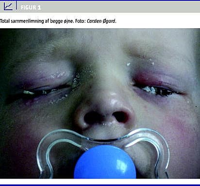 Ved ankomst var patienten grædende, men ikke forpint. Objektivt fandtes sammenklistrede øjenlåg men frit bevægelige bulbi (Figur 1 ). Der afventedes i 24 timer, men da der ikke var mindste tegn på bedring, gennemføres kirurgi i generel anæstesi. Under indgrebet overklippedes cilier, og limrester blev fjernet. Bulbi fandtes upåvirkede med klare corneae uden abrasio. Efter operationen behandledes med chloramphenicolsalve × 4 i begge øjne. Ved efterfølgende kontrol en uge efter var drengen i habitualtilstand, og der fandtes normalt visus og i øvrigt normal øjenundersøgelse.