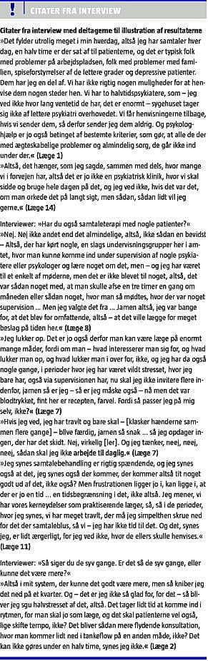 Formålet med studiet var at undersøge, hvordan praktiserende læger oplever muligheden for at udføre samtaleterapi, og hvordan behandlingen kan indpasses i arbejdet.