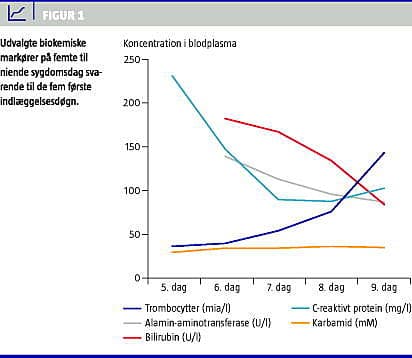 Paraklinisk fandtes ved indlæggelsen og over de næste dage kraftigt påvirkede infektionsparametre, begyndende koagulopati, betydeligt nedsat nyrefunktion og moderat påvirket leverfunktion (Figur 1 ). Patienten blev på mistanke om urinvejsinfektion sat i behandling med cefuroxim. Kliniske tegn på koagulationsforstyrrelser i form af subkonjunktivale blødninger og petekkialt eksantem på underekstremiteterne tilkom på syvende sygdomsdag.