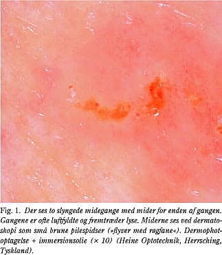 Diagnosen stilles på det kliniske billede og påvisning af scabiesmider og -gange. Scabiesgange ses bedst i lup og i kraftigt lys, hvor de fremstår som uregelmæssige, oftest mørke, mm til mm brede, slyngede linjer af varierende længe fra få mm til flere cm. I den ene ende ses ofte et mørkt, brunligt punkt, selve scabiesmiden (Fig. 1). Denne vil typisk hænge fast på nålespidsen, hvis en ikke for spids nål (knappenål) med små sidebevægelser føres gennem scabiesgangen.