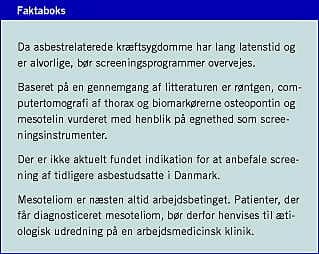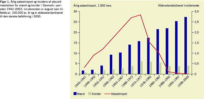 Asbestbetingede sygdomme er stadigt et aktuelt problem i Danmark. Dels eksisterer der stadig asbestholdigt materiale i gamle bygninger, og dels er det et biologisk faktum, at asbestbetingede sygdomme som regel først debuterer efter en latenstid på 20-40 år. Asbest kan forårsage lungeasbestose, pleurale plaques, bronkogent karcinom og mesoteliom i pleura og peritoneum. I Danmark er incidensen af mesoteliom i pleura stigende (Figur 1). Det forventes, at incidensen af pleuralt mesoteliom i Europa stadig vil stige og først vil begynde at aftage i 2015-2020.