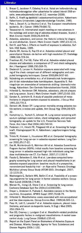 I en ukontrolleret undersøgelse fra Finland har man med LDCT screenet en gruppe på 602 personer, som havde arbejdet med asbest i mindst 20 år, som alle havde asbestose og/eller pleurale plaques, og som alle var rygere [16]. Man fandt fem tilfælde af lungecancer og et tilfælde af mesoteliom i peritoneum. Desuden fandt man 18% falsk-positive dvs. fortætninger, som ved en videre diagnostisk udredning viste sig ikke at være neoplasmer. I en tilsvarende ukontrolleret undersøgelse fra Tyskland har man screenet 187 personer, som havde arbejdet med asbest gennem mange år [17]. I alt 51 personer skulle gennem yderligere undersøgelser. Slutresultatet var otte tilfælde af lungekræft og ingen med mesoteliom. I Italien har man også i en ukontrolleret undersøgelse screenet 1.045 as-bestudsatte personer med LDCT og thoraxrøntgen. Pga. suspekte forandringer ved disse undersøgelser gennemgik 517 personer yderligere HRCT, og efterfølgende var der 21 per-soner, der gennemgik invasive diagnostiske procedurer. Der fandtes neoplasmer hos ti af disse. Ingen af dem havde mesoteliom. I et andet italiensk studie, hvor der blev screenet 1.119 asbestudsatte personer med LDCT, blev der diagnosticeret lungekræft hos fem personer. Ved screening af rygere med LDCT har man fundet lungekræft hos 0,5-2,5% af deltagerne og 5-66% falsk-positive resultater.