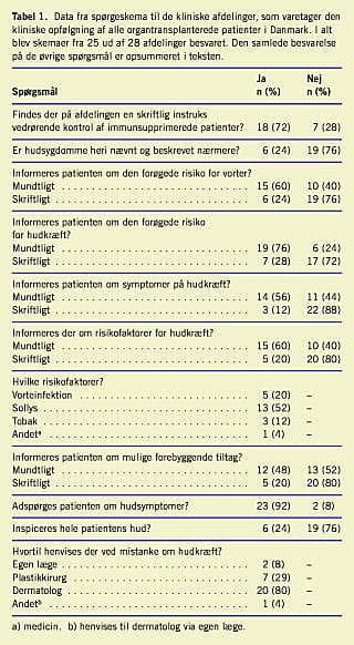 Resultater: På seks (24%) af de adspurgte afdelinger inspiceres patienternes hud ved den ambulante opfølgning. På 15 af afdelingerne (60%) informeres de organtransplanterede patienter mundtligt om risikofaktorer for hudcancer, og på blot fem (33%) af de 15 afdelinger medgives der relevant skriftligt informationsmateriale.