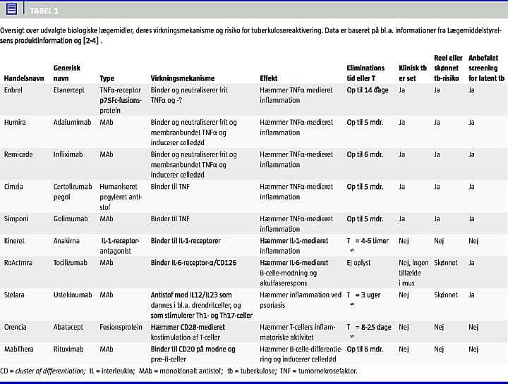 Tuberkulose (tb) forårsages af bakterien Mycobacteriumtuberculosis . Smitte sker, når en person med lunge-tb hoster eller nyser og herved producerer infektiøse aerosoler. Af de smittede vil der hos 10% udvikles aktiv tb. Hos de resterende 90% vil der etableres en latent tb-infektion med ganske få persisterende mykobakterier, der er indkapslede i et granulom. Under normale immunologiske forhold holdes infektionen i ave, den er subklinisk, og personen er rask. Den latente infektion kan blusse op, hvis den immunologiske kontrol svækkes, som det ses ved underernæring, diabetes, nyreinsufficiens, erhvervet immundefekt (f.eks. hiv-infektion) og medikamentel immunsuppression [1, 2]. Det immunologiske forsvar involverer en lang række celler, og cytokiner og tumornekrosefaktor (TNF) α spiller her en helt central rolle [2, 3].