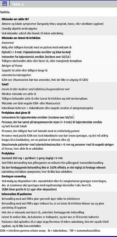 Summary Screening for tuberculosis infection prior to medical therapy Ugeskr Læger 2011;173(12):893-896 Tumour necrosis factor antagonists (anti-TNFα) have become an invaluable treatment against chronic inflammatory diseases. Individuals treated with anti-TNFα have more than a fourfold increased risk of tuberculosis (TB) reactivation depending on the clinical setting and the TNF-antagonist used. All candidates for anti-TNFα treatment in Denmark should be evaluated for possible latent TB using history of exposure, chest X-ray and an interferon-γ release assay. Preventive chemotherapy is recommended for all individuals with latent TB infection before initiation of anti-TNFα as it is expected to reduce the risk of progression to active TB.