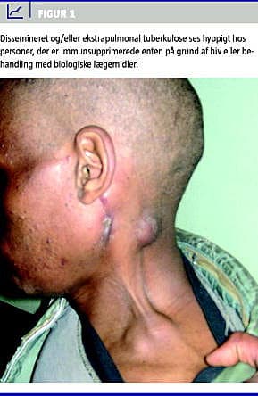 Biologiske lægemidler består af en heterogen gruppe stoffer, der er modificerede (poly)peptider fra levende organismer og designet til at modulere en specifik biologisk proces [4]. Det kan være monoklonale antistoffer, rekombinante cytokiner, cytokinreceptorer, fusionsproteiner og vækstfaktorer. Virkningsmekanismerne er typisk blokering eller hæmning af en patologisk celle, leukocytrekruttering af cellekontakt eller ændring af cytokinbalancen. Biologiske lægemidler anvendes til alvorlige dermatologiske, reumatologiske og gastroenterologiske lidelser, og til behandling af onkologiske, hæmatologiske og neurologiske lidelser samt ved transplantationer. De nye biologiske lægemidler påvirker immunforsvaret på forskellig vis, og man har set en uventet høj forekomst af tb-reaktivering efter indførelsen af disse stoffer. Det ser ud til, at monoklonale antistoffer mod TNF og opløselige TNF-receptorer (anti-TNFα) især er medvirkende til denne reaktivering [2, 3, 5, 6]. Langvarig immunsuppression øger risikoen for, at en latent tb-infektion reaktiveres, og samtidig er risikoen for, at en ny eksposition for M. tuberculosis giver anledning til sygdom, vedvarende stor. Man anbefaler derfor også at screene og behandle personer for latent tb-infektion før behandling med biologiske lægemidler [1, 2, 6]. Sådanne anbefalinger gælder for samtlige TNFα-hæmmere og for visse af de andre biologiske lægemidler til behandling af inflammatoriske sygdomme (Tabel 1 ). Der er forskel på de forskellige TNFα-antagonister, hvad angår struktur, bindingsmåde, bindingsaffinitet, farmakokinetik, indgiftsmåde samt dosering, og de har forskellig terapeutisk virkning og bivirkningsprofil. Tiden fra start på anti-TNFα-behandling til udvikling af tb er f.eks. kortere ved behandling med infliximab (ca. 12 uger) end ved behandling med eternacept (ca. 12 mdr.) [2, 3], og risikoen for, at der udvikles tb, er højere ved brug af adalumimab og infliximab end ved brug af eternacept, men der er stor variation [2, 3]. For alle stofferne gælder det, at tb ofte er ekstrapulmonal (Figur 1 ) og dissemineret [2, 3, 5, 7], men i forbindelse med tb-screening gøres der ikke forskel på de enkelte TNFα-hæmmere (Tabel 1).