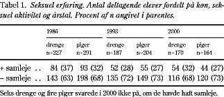 Der var uændret en tredjedel af alle eleverne, som havde debuteret seksuelt (Tabel 1 ). Der var fortsat ingen forskel på drenge og piger. Femten procent var under 15 år ved deres seksuelle debut, mod 14% og 16% i henholdsvis 1986 og 1993. Af alle deltagende elever var 26% seksuelt aktive, idet de havde haft mere end et samleje.