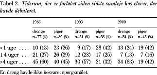 Af de debuterede angav 33%, at de havde haft samleje inden for den sidste uge. Der var i modsætning til tidligere (2), ingen forskel på pigers og drenges aktivitet (Tabel 2 ). Der var fra 1986 til 1993 sket en stigning i andelen af elever, som havde haft samleje inden for den seneste uge (p<0,05; df=1). Denne ændring holdt sig, uden yderligere stigning, frem til år 2000.