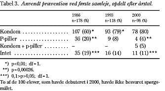 Færre end tidligere anvendte prævention ved hvert samleje, der var således to tredjedele i 1986, tre fjerdedele i 1993 og godt halvdelen i 2000 (2000 vs. såvel 1986 som 1993: p<0,001; df=1). Af de elever, der havde debuteret, angav 10% at bruge prævention en gang imellem eller næsten aldrig.