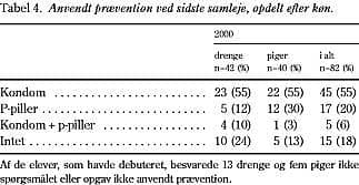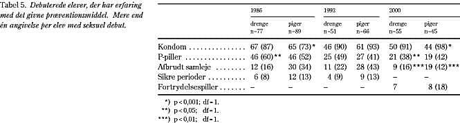 De præventionsformer, som eleverne havde personlig erfaring med, var uændret fra tidligere, bortset fra den stigning, der skete fra 1986 til 1993 i andelen af elever, der havde erfaring med kondom (Tabel 5 ). Stigningen var fra 1986 til 2000 højsignifikant for piger, men ikke-signifikant for drenge. Der var ingen signifikant stigning fra 1993 til 2000. Signifikant færre drenge havde erfaring med p-piller i 2000 i forhold til 1986. Der var signifikant flere piger end drenge, som anvendte afbrudt samleje, dette var uændret fra tidligere.