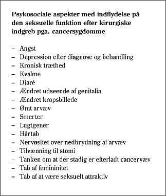 Efter vulvektomi pga. vulvacancer beskrev man i en undersøgelse af seksuel dysfunktion signifikant ændrede kropsbilleder, signifikant nedsat samlejefrekvens ofte forårsaget af seksuel aversion, manglende lystfølelse og nedsatte eller manglende seksuelle fantasier eller lyst til seksuel aktivitet. I undersøgelsen viste man endvidere, at der ikke var sammenhæng mellem graden af seksuel dysfunktion og omfanget af det kirurgiske indgreb. Ved total pelvisexenteresis efter cancer i vesica urinaria, vagina eller rectum er seksuelle dysfunktioner hovedreglen. Kirurgisk konstruktion af en neovagina er beskrevet. Cirka 50% genoptager aldrig seksuallivet efter denne operation. Ved en objektiv undersøgelse af vagina beskrives en potentielt fungerende vagina hos 70%. Hovedproblemerne med en neovagina er psykosociale og problemer med vaginal tørhed og udflåd.
