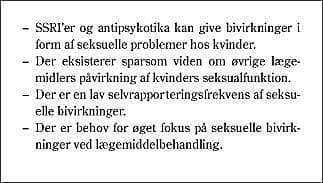 Oversigtsartiklen beskriver seksuelle problemer hos kvinder som bivirkning til lægemiddelbehandling. Seksuelle problemer hos kvinder omfatter libido-, lubrikations-, orgasme- og smerteproblemer. Der er meget sparsom viden om lægemidlers indflydelse på kvinders seksualfunktion. Behandling med SSRI-præparater og andre antidepressiva kan medføre nedsat lyst og orgasmeproblemer. Antipsykotika giver ofte seksuelle bivirkninger i form af libido-, lubrikations- og orgasmeproblemer. Spironolacton kan medføre nedsat libido og hæmmet lubrikation. Hvorvidt antihypertensiva, H 2 -receptorantagonister samt kønshormoner har seksuelle bivirkninger er ikke afklaret ordentligt. Visse lægemidler, bupropion og sildenafil, kan måske forbedre seksualfunktionen hos kvinder, men der mangler større materialer. I artiklen beskrives, at fortsat forskning inden for området er nødvendig.