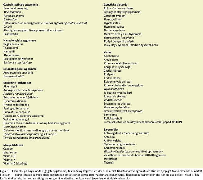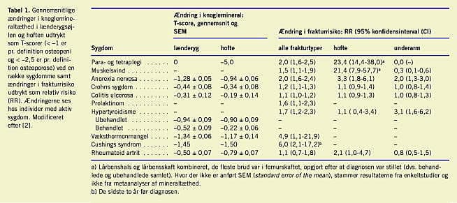 ITabel 1 vises en oversigt over ændringerne i knoglemineraltæthed (BMD) og frakturrisiko ved forskellige sygdomme, der er relateret til sekundær osteoporose.