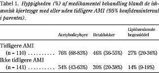 Tabel 1 viser, at forebyggende medicin blev anvendt signifikant hyppigere til den del af patienterne, som tidligere havde haft AMI. I denne gruppe fik 76% acetylsalicylsyre, 46% betablokkere og 27% lipidsænkende lægemidler. Der var ingen signifikant kønsforskel inden for nogen af grupperne. Blandt patienter med tidligere AMI fik 16% (95% sikkerhedsinterval: 11-24%) både acetylsalicylsyre, betablokkere og lipidsænkende lægemidler, mens 41% (32-50%) fik acetylsalicylsyre og betablokkere, men ikke lipidsænkende lægemidler.