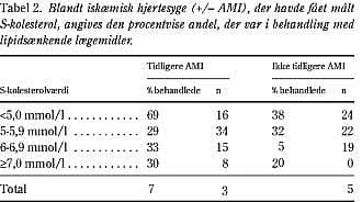 Ved S-kolesterolværdi ≥ 5,0 mmol/l blev lipidsænkende lægemiddel anvendt af 33% (21-48%) af patienterne med tidligere AMI og af 19% (10-32%) af de øvrige. Sammenhængen mellem S-kolesterol og behandling med lipidsænkende lægemidler fremgår af Tabel 2 . Af de patienter med tidligere AMI, der havde fået målt deres kolesterolniveau inden for det seneste år, fik 41% (31-52%) lipidsænkende behandling, mens dette kun var tilfældet hos 24% (17-35%) af de iskæmisk hjertesyge uden AMI.