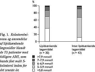 Fig. 1 viser fordelingen af S-kolesterol for de 73 patienter med tidligere AMI, som havde fået foretaget måling. Det fremgår, at 37% af de patienter, som var i behandling med lipidsænkende lægemiddel, havde S-kolesterol ≤ 5,0 mmol/l, mens kun 12% af dem, der ikke var i behandling, lå under denne grænse (p = 0,02).